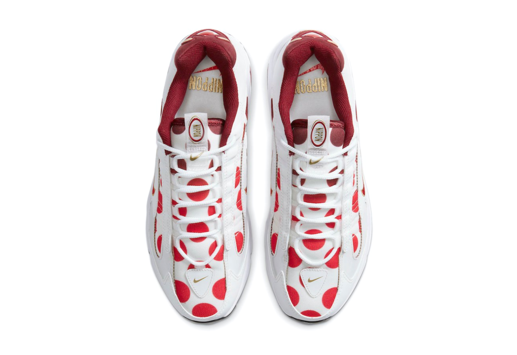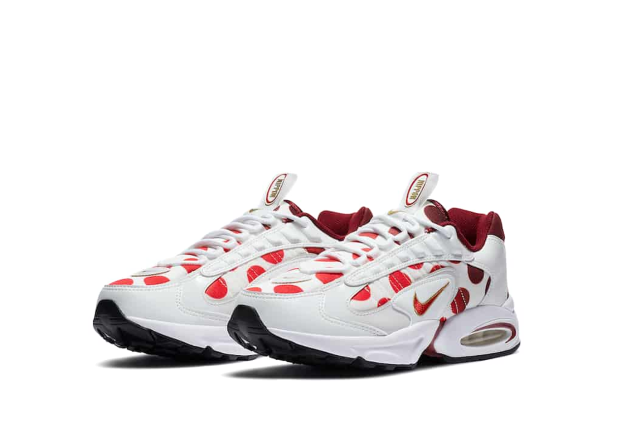 These polka dots offer a compelling gradient effect, with the Triax shifting from a dark burgundy on the forefoot to a rousing red around the heel while the Tailwind offers the inverse, starting off bright and moving to dark. Both also serve up metallic gold trim and special “Nippon” spellouts. These text hits appear on the Triax’s tongue tab and insoles, while they grace the heel, tongue and insoles of the Tailwind. The Triax takes things a step farther as well, slapping a flag-inspired detail on the heel. Both styles mix airy white leathers and meshes for their base layers, rim red Swooshes with more gold trim, and complete their respective looks with clear Air Max units.