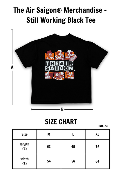 The Air Saigon® Merchandise – Still Working Black Tee Tinh thần: Vẫn đang làm — không phải vì chưa xong, mà vì mình đang enjoy quá trình đó. Khi thời gian trôi qua rất nhanh, là lúc mình biết mình đang làm điều mình đam mê
